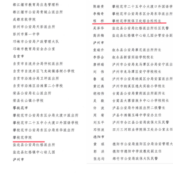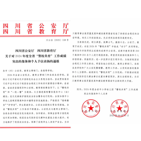 近日,四川省公安厅、四川省教育厅联合下发《关于对2024年度全省“警校共育”工作成绩突出的集体和个人予以表扬的通报》,对在全省“警校共育”工作中作出突出贡献的集体和个人进行表彰。攀枝花学院被评为“成绩突出集体”,学校保卫处综合科科长程桥同志被评为“成绩突出个人”。此次荣获双项表彰,是省级主管部门对我校平安校园建设和“警校共育”工作成效的充分肯定。