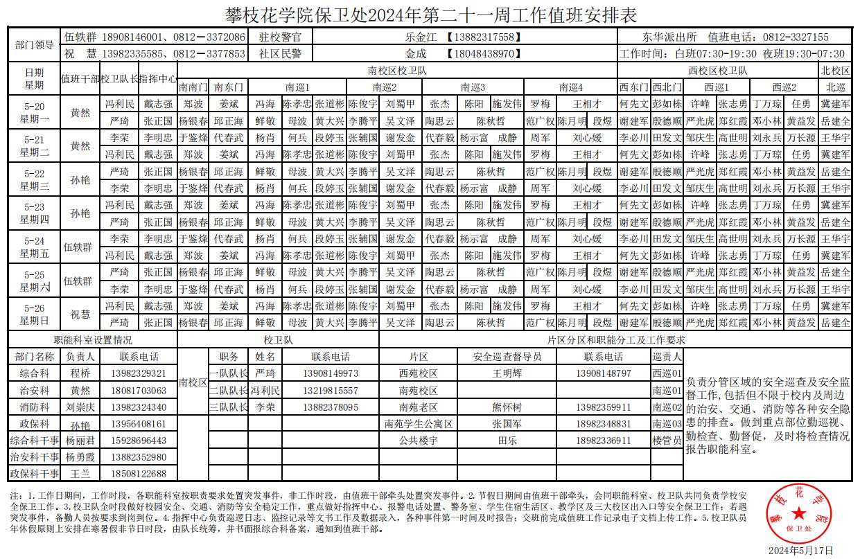 攀枝花学院保卫处2024年第21周工作值班安排