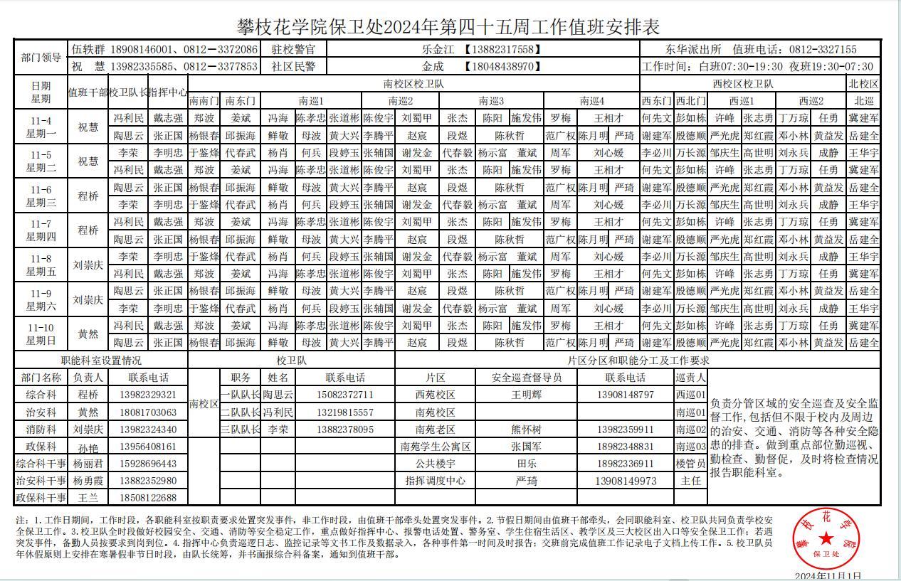 攀枝花学院保卫处2024年第45周工作值班安排