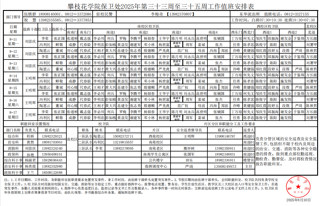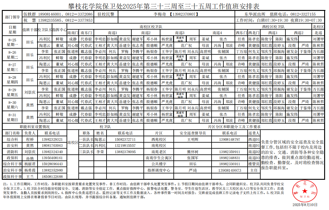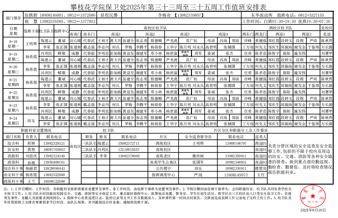 攀枝花学院保卫处2025年第33-35周工作值班安排