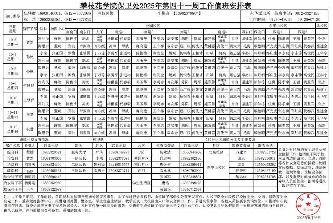 攀枝花学院保卫处2025年第40-41周工作值班安排
