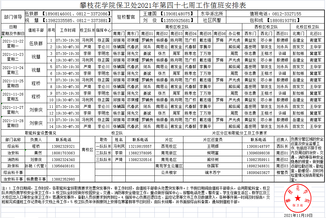 攀枝花学院保卫处2021年第47周工作值班安排