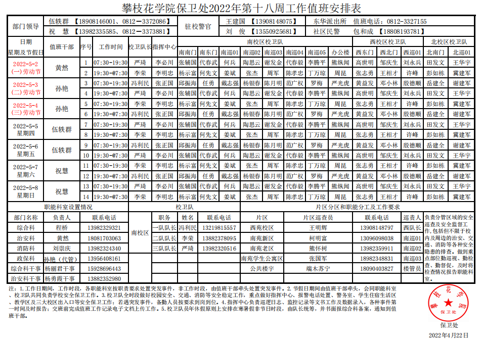 攀枝花学院保卫处2022年第17周-18周工作值班安排